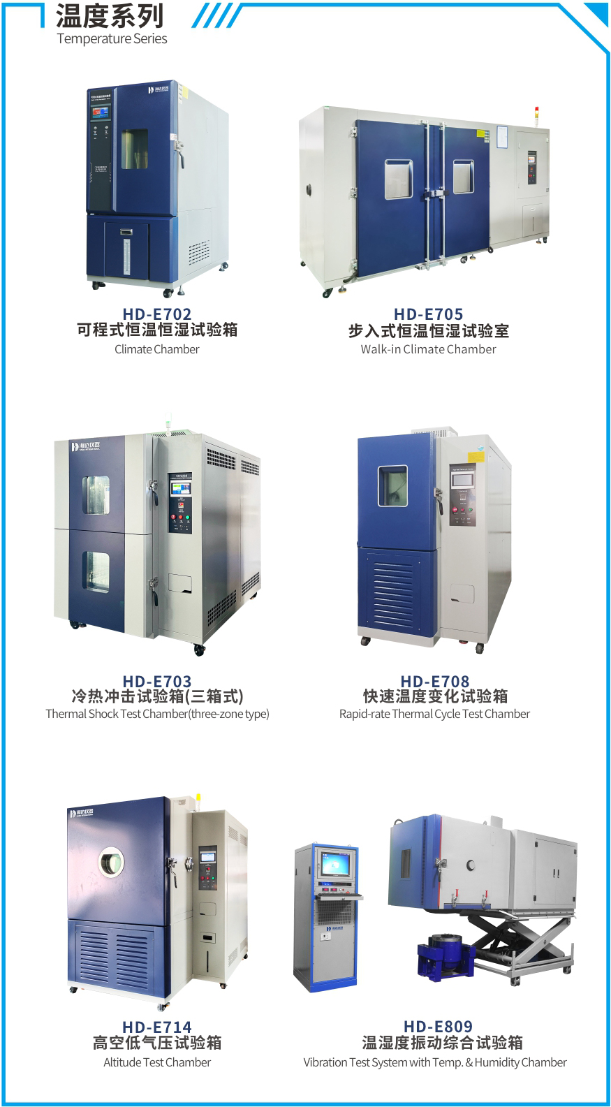 温度系列试验:恒温恒湿试验箱、冷热冲击试验箱、高空低气压试验箱、温湿度振动综合试验箱等检测仪器可模拟恶劣气候,以验证材料稳定性。