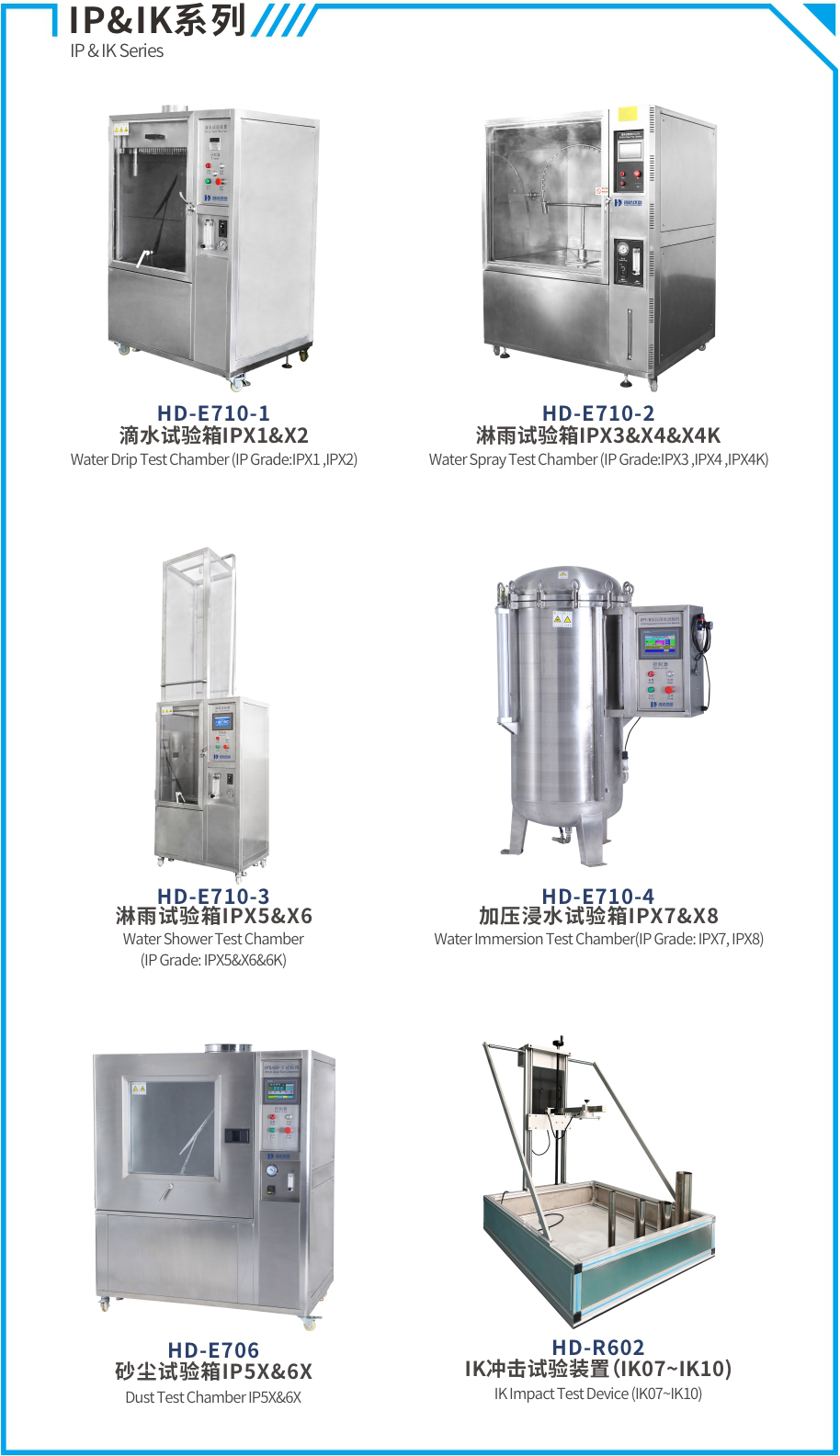 IP&IK防护测试:淋雨试验箱、砂尘试验箱与冲击试验装置适用于户外灯具和智能路灯的防水测试及灯具照明产品的外壳抗冲击强度测试。
