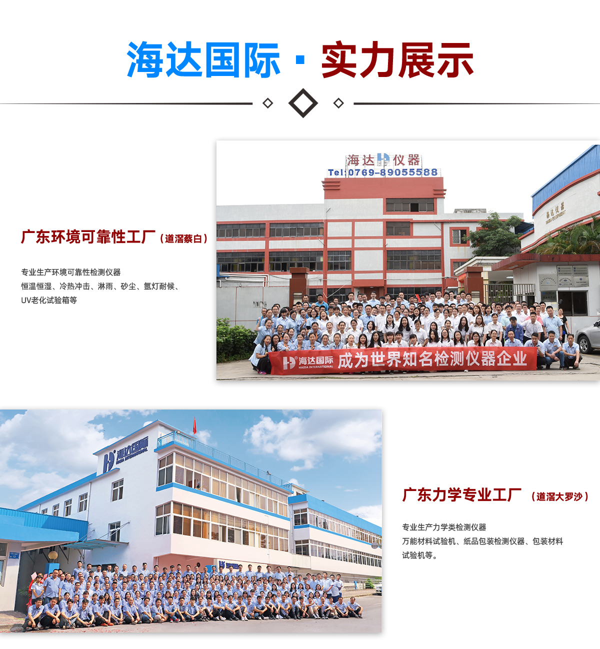 主营业务范围:仪器生产、非标仪器定制、软件开发、计量检测及维修咨询整包服务。公司通过ISO9000认证以及国际知名检测机构BV、SGS、TUV的多次认证,产品符合GB、ISO、ASTM、EN、JIS、TAPPI、ISTA、DIN、BS等国内外标准。投入大量研发资金,坚持研发一代、销售一代、储备一代的产品理念,始终走在行业的前端。参与家具测试标准编写,与国家质检单位共同起草CY/T229-2020行业标准;与国家纸制品中心、东莞质检家居实验室共同开发行业测试仪器;并与多家知名单位共建可靠性实验室,与黄埔海关技术中心合建危险品包装实验室。