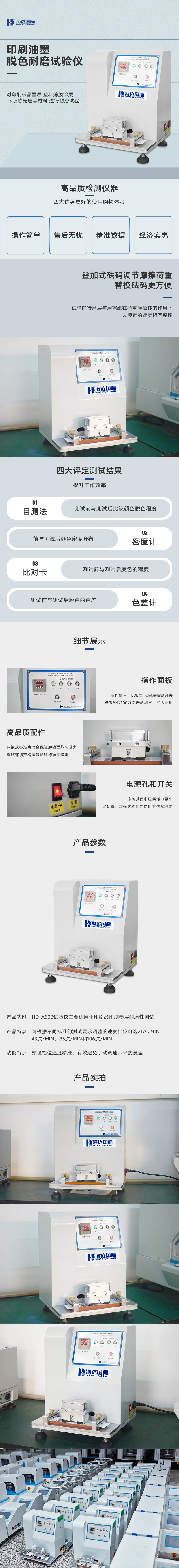 HD-A508B印刷油墨脱色耐磨试验仪主要适用于印刷品印刷墨层耐磨性测试。将标准尺寸的摩擦纸包于摩擦头,以规定的速度、压力等对试样表面进行摩擦,观察试样墨层脱落情况。
