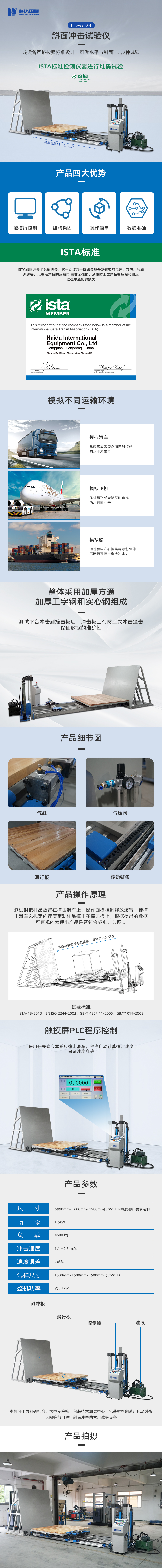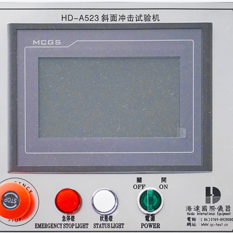 斜坡冲击试验台模拟产品包装在实际运输环境中抗冲击损坏的能力,如产品的运输等,本机也可作为科研机构、大中专院校、包装技术测试中心、包装材料制造厂以及外贸、运输等部门进行斜面冲击的常用试验设备。