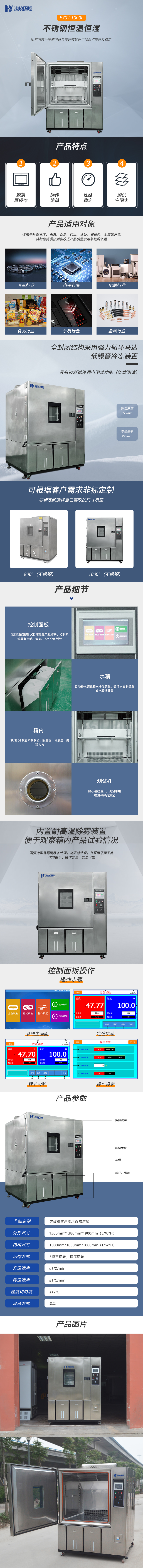 高低温恒温试验箱能模拟各种温湿度环境,适用于检测电子、电器、食品、汽车、橡胶、塑料胶、金属等产品,满足GB/T2423, GJB150A1/4各种恶劣环境下的可靠性机稳定性能等参数,将给您提供预和改进产品质量及可靠性的依据。