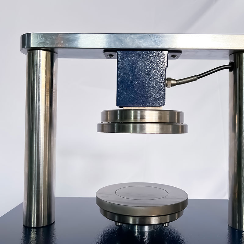 环压机使用马达传动螺杆而使动压盘移动,将装置好试样试验夹具置于上下两压盘之间,然后施予规定之速度,下压盘向上压缩试样时,上压盘上端的力量传感器即感受到压力;并将力量转换成电压讯号输给显示器。