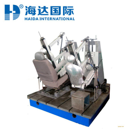 汽车座椅头枕性能强度试验机试验方法: 1.座椅及头枕在试验机上的安装 座椅及头枕按实车的安装条件安装在试验机上。具有调节机构的座椅及头枕的位置按下述要求来调节,其他的调节机构调节到设计标准位置。 2.座椅靠背的角度调节到设计标准位置,或者选择50百分位人体模型的躯干基准线偏离铅垂方向尽量接近250角. 3.静态试验时,在高度方向将头枕调节到设计上的***高位置后,在前后方向再调节到***后位置。 4.动态试验时,在高度方向将头枕调节到设计上的***低位置后,在前后方向再按下述要求调节。 a.做 前 方撞击试验时,调到设计上的***后位置。 b.做 后 方撞击试验时,调到设计上的***前位置。 5.静态试验 假背的H点与座椅R点重合,用假背对座椅加载,使得绕H点的后翻力矩为373N"m,确定此时的移位躯干基准线的位置。 6.在坐椅中心面上用头型绕R点对头枕施加373 N·m的力矩,载荷作用点为从头枕的顶端沿着平行于座椅移位前的躯干基准线向下“mm处,如图1所示,载荷作用方向与移位躯干基准线垂直,测量加载时的头型移位的***前端和移位躯干基准线之间的距离(简称头型的移动量),同时检查头枕有无破损。 7.进一步将载荷加载至890 N,检查头枕、座椅及骨架等有无破损或脱落。 8.撞击点位于座椅中心面上,且在与水平面成450角的直线与头枕后面相切的切点上,沿与水平面成45。角,将头型以25士1 km/h的速度向头枕的后面撞击。
