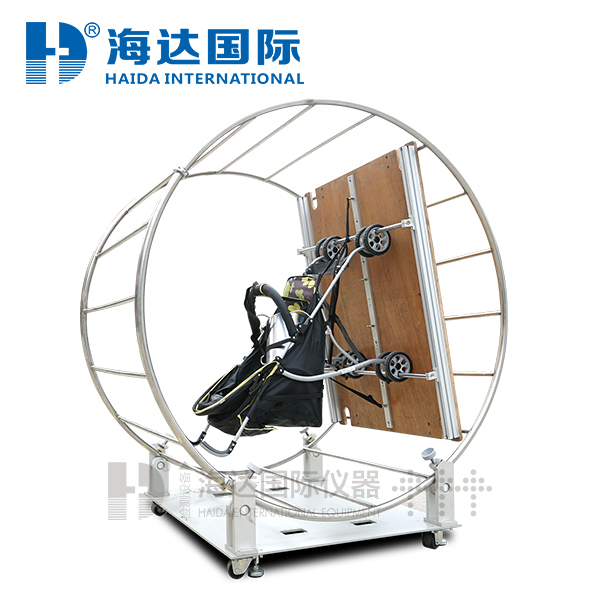 本试验机通过模拟婴儿车在重复变换角度的往复运动中过程中,随着受力位置的变化,观察受力部位是否会变形或损坏,检测婴儿抽推车子的附件附着能力,帮助厂家不断提高产品质量品质