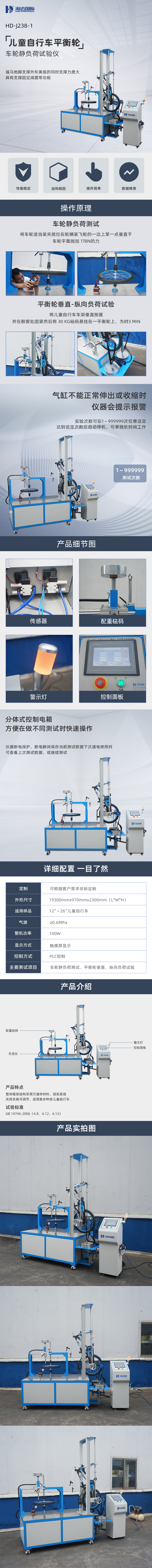 检测项目:儿童自行车平衡轮、车轮静负荷试验。