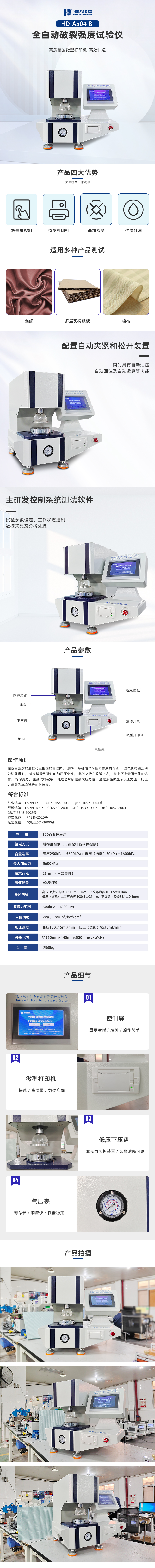 是国际通用型缪纶(Mullen)式仪器,只要放进材料,即自动侦测,自动试验,自动油压回位及自动计算、储存测试数据、打印,仪器用数字显示并能自动打印测试结果和数据处理。