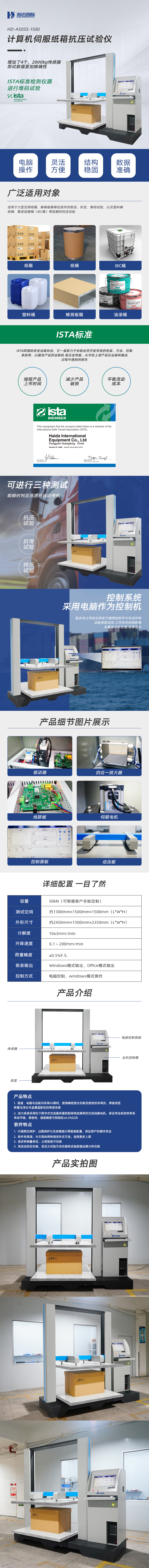 1、本机是检验纸箱或其它包装容器耐压强度*直接的测试仪器,用于判定纸箱的抗压能力,并可做持压堆码的测试,试验的结果可作为工厂堆放成品包装箱高度的重要参考或是设计包装箱的重要依据。适用于瓦楞纸箱、蜂窝板箱等包装件的耐压、形变、堆码试验。并兼顾塑料桶(食用油、矿泉水)、纸桶、纸盒、纸罐、集装容器桶(IBC桶)等容器的抗压试验。