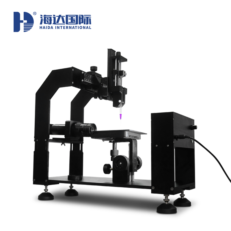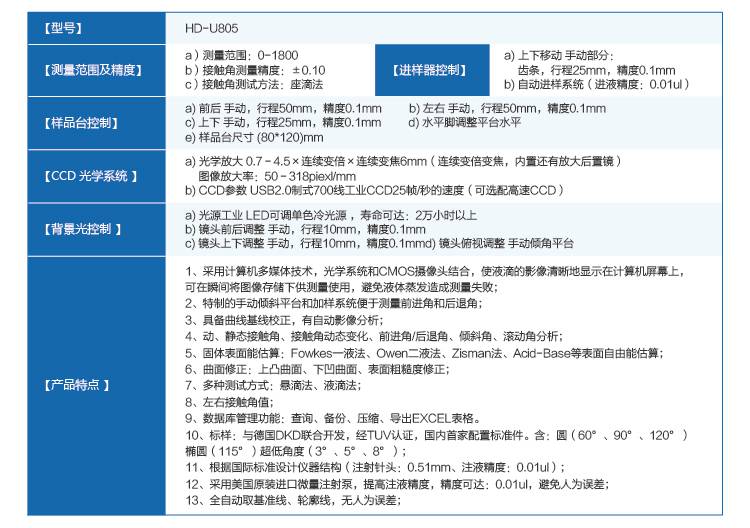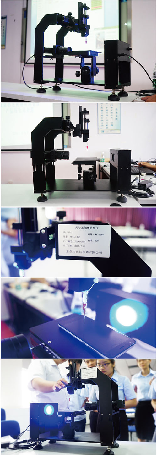 本公司仪器采用现代化工艺制造,仪器采用先进的专用CCD数字摄像机,配倍高分辨率变焦式显微镜和高亮度LED背景光源系统,搭配三维样品台,可进行工作台上下、左右、前后等方向移动。实现微量进样及上下、左右精密移动。同时还设计了伸缩杆结构工作台,能适应在不同用户材料厚度加大的场合。仪器框架可以根据式样大小适量调节,扩大了仪器的使用范围。软件搭配修正功能,测试多次后的结果可以同时保存在同一报告下,能让用户更好的对材料数据进行管控。该仪器设计美观大方、操作简单、符合用户所需。适用于各种行业测定接触角的用户。