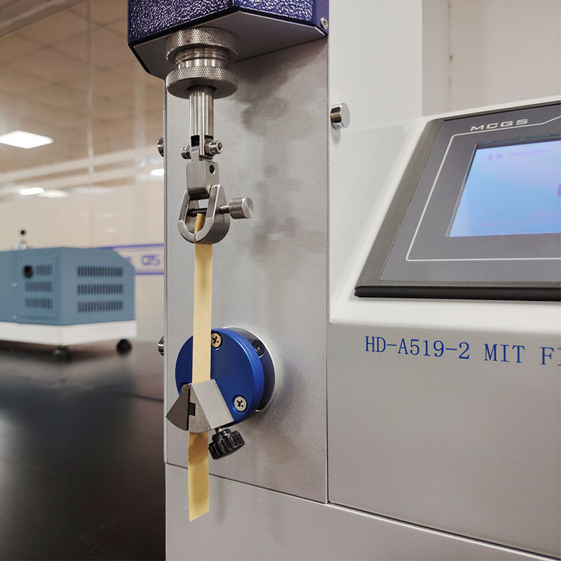 本机专门检测纸及纸板之耐折强度,试法是将试片两端固定于机上,下夹具施与所须之荷重,使试片承受一定之张力,下夹具在试片垂直状态下向左右两边往复弯折试样,弯折角度为135度,直到折断试片,并自动计数。