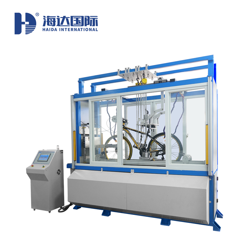 本试验机适用于自行车的道路动态试验及制动性能试验,参照DIN79100、EN14764、EN14765、EN14766、EN14718标准制作,机台模拟路面由两个滚轮组成,按试验要求在车底座、踏板、把手、货架上各装载荷重后固定于试验机上,通过道路动态试验来模拟自行车在路面的行驶过程,从而检测自行车性能,也可以通过制动性能试验来测试自行车手刹的性能。