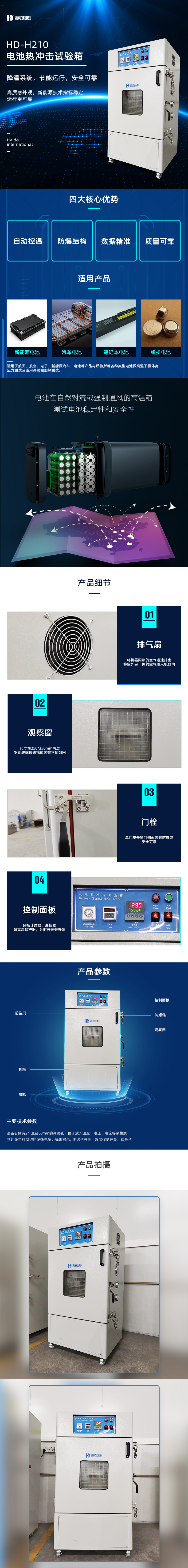 HD-H210电池热冲击试验箱是模拟电池放置在自然对流或强制通风的高温箱中,以一定的升温速率升温至设定测试温度并保持一定时间,采用热风循环系统,可保证工作温度分布均匀。