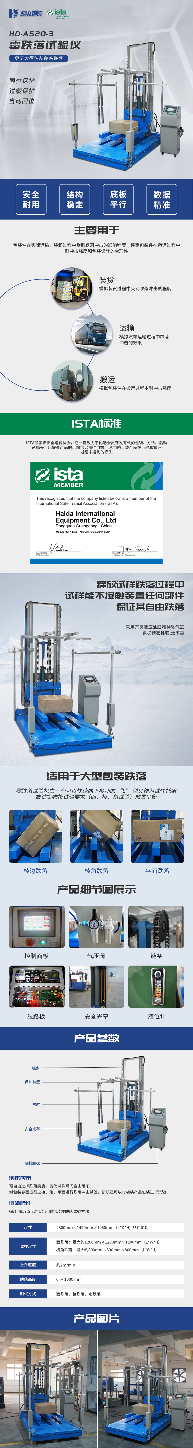 测试时把样品放置在E字支架上,确定测试方式(面跌落、棱跌落、角跌落),使用扶架固定样品,操作面板控制释放装置,使样品升到设定高度后以自由落体的方式跌落到底板上,根据得出的数据可直观的表现出产品是否符合标准。