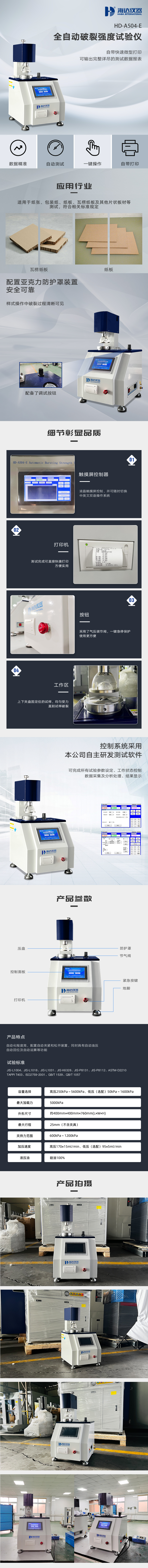 HD-A504-2全自动破裂强度试验仪是针对纸和纸板的强度性能进行检测的仪器,主要适用于各种纸板及单层和多层瓦楞纸板的测试,也可用于丝绸、棉布等非纸质材料的耐破强度测试。