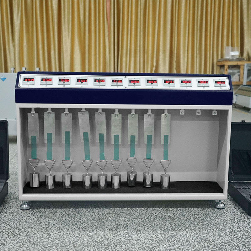 HD-C524-12 常温胶带保持力试验仪(12组),针对胶带的粘合力做静态负荷试验,在一定的荷重下对胶带所能保持的时间计时,以得到胶带粘合的耐久性。