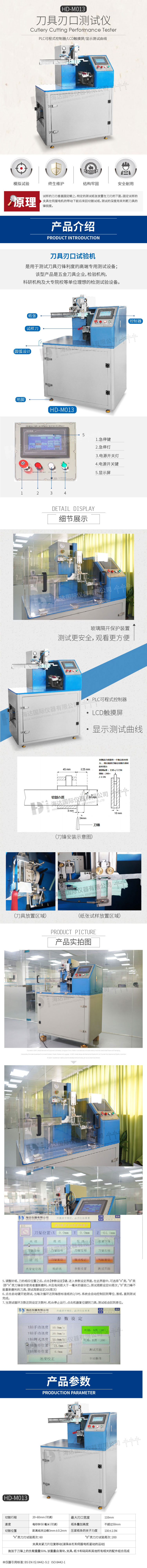 乐思体育HD-M013刀锋锐利度测试仪,测试刀具的锋利度值,PLC微电脑程序控制,操作简单,稳定准确,LCD触摸屏,操作界面友好,使用简便,具有割点自动定位、刀具自动复位切割功能,实时显示刀具切断测试材料所需的力值及切断力曲线。