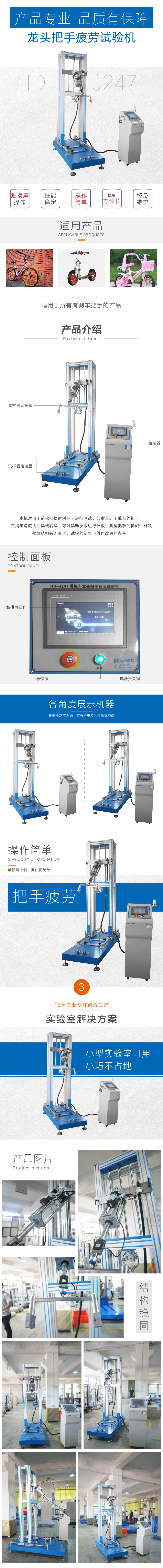 HD-J247滑车龙头手把杆疲劳试验仪专用于滑板车、童车、手推车等车把手的疲劳度测试。滑板车在使用时,人对车把手会产生一个按压或拉伸的力,本仪器便是模拟这种循环拉压过程,来观察记录滑板车把手机械性能及整体结构的疲劳情况。