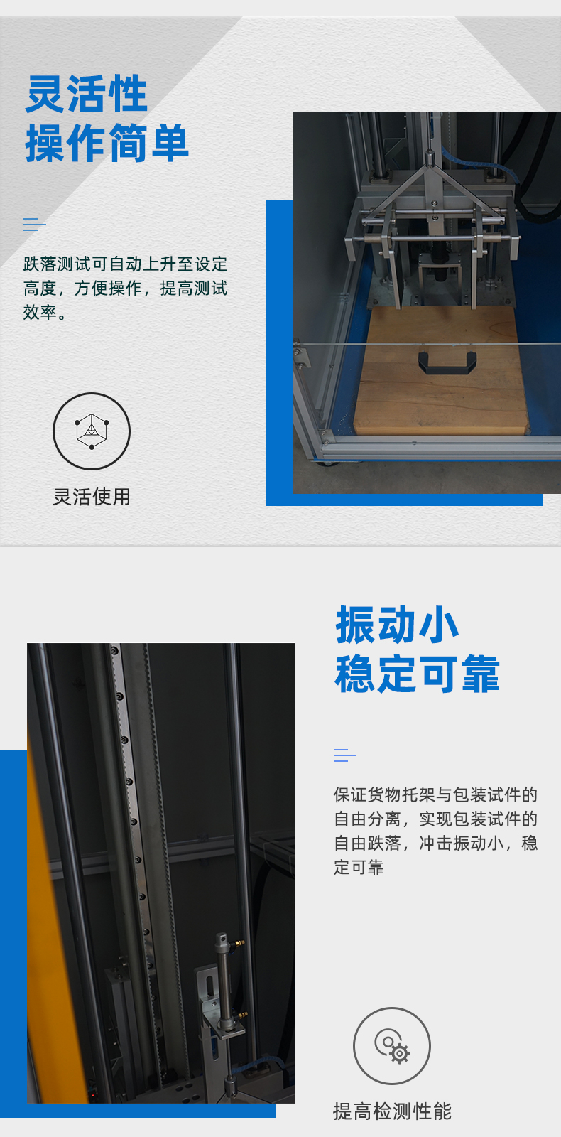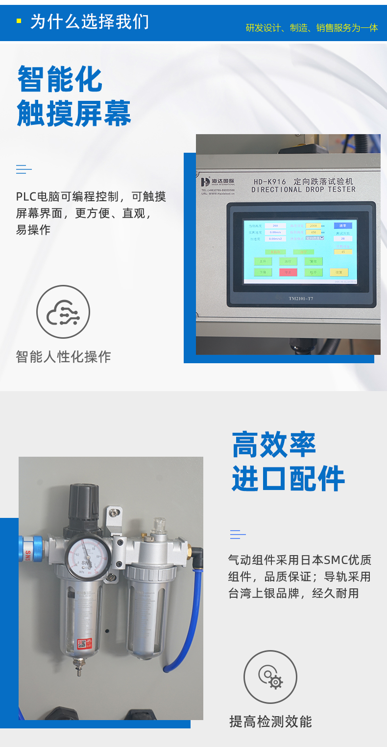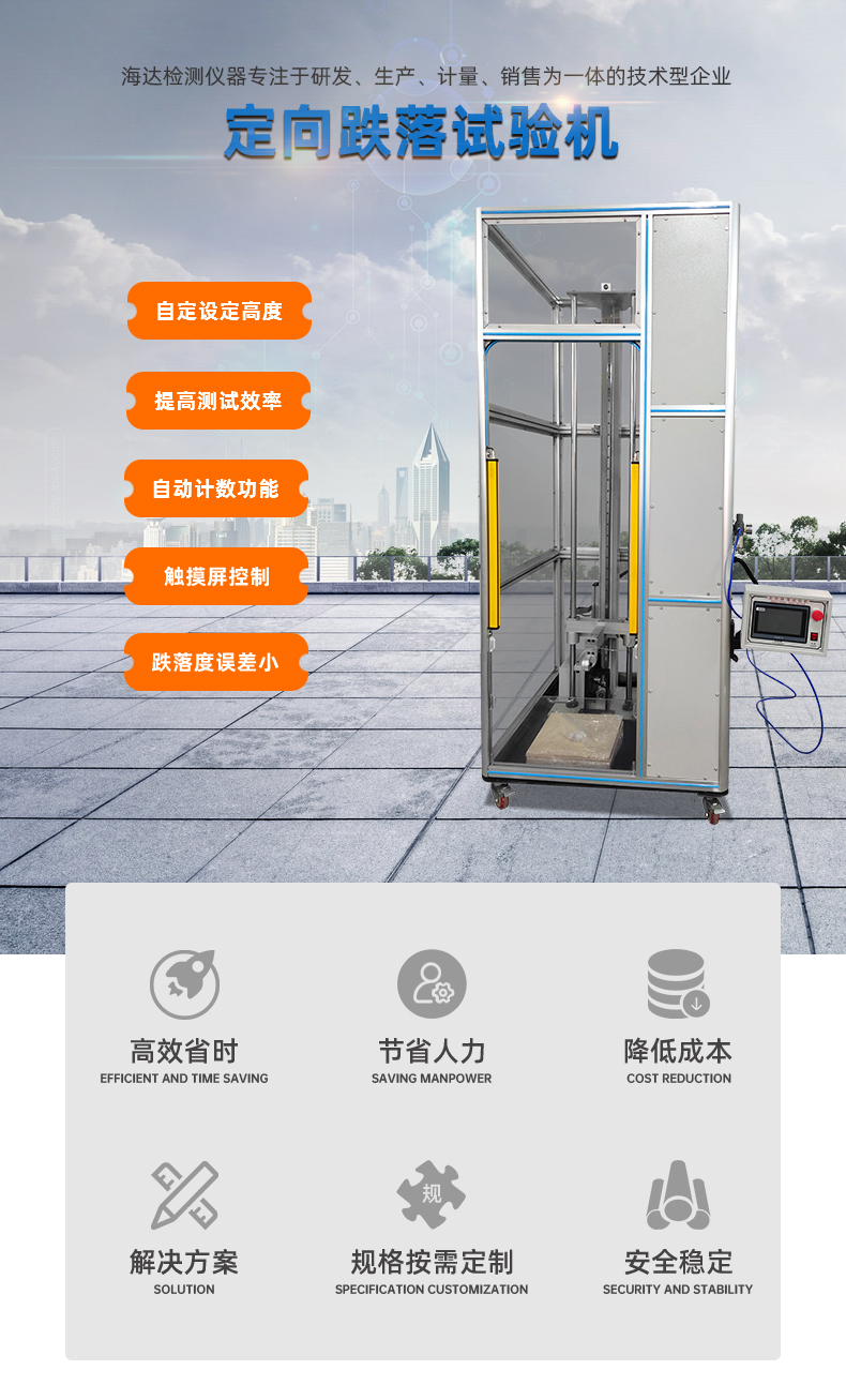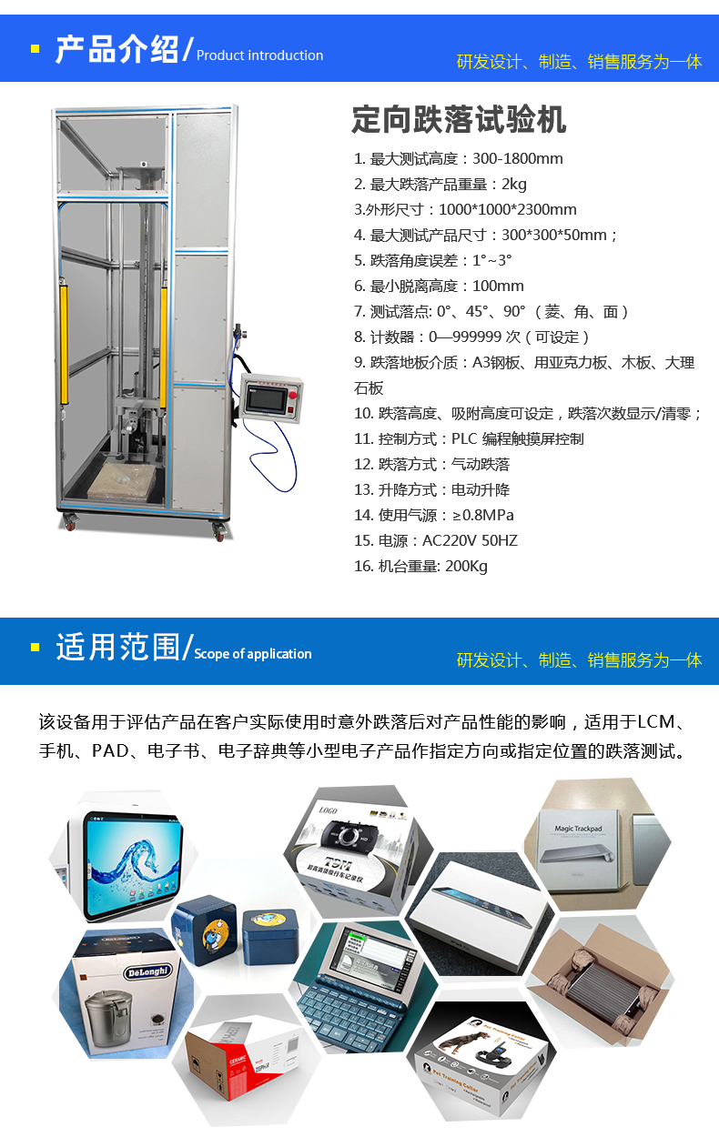该设备用于评估产品在客户实际使用时意外跌落后对产品性能的影响,适用于 LCM、手机、PAD、电子书、电子辞典等小型电子产品作指定方向或指定位置的跌落测试。