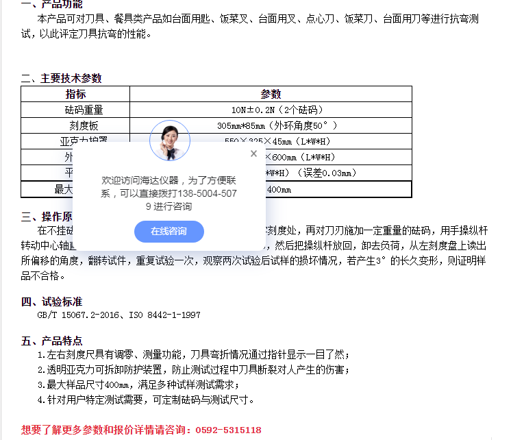 刀具抗弯测试仪通过抗弯测试作为刀具抗弯的判断依据;如咖啡壶或茶壶、汤匙、点心匙、饭菜匙、台面用匙、点心叉、饭菜叉、吃鱼用叉、台面用叉、点心刀、饭菜刀、吃鱼用刀、台面用刀