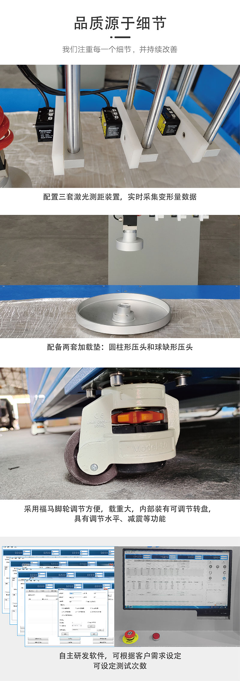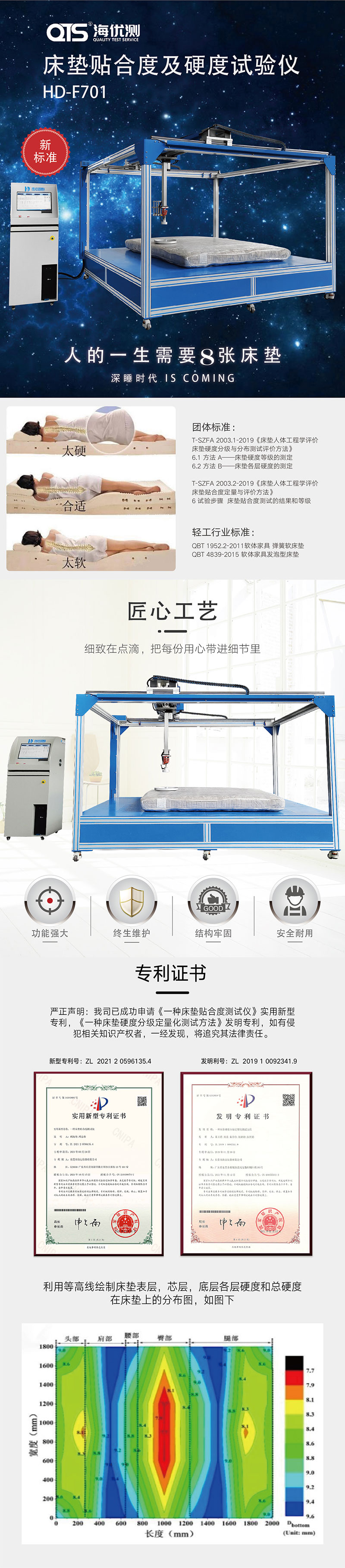 床垫贴合度及硬度试验仪用于对家庭、酒店、旅馆、饭店等场合使用的弹簧软床垫和发泡型床垫进行出厂成品检测,对床垫硬度和滞后损失率及贴合度进行测试,测试完成后根据测试评定试样的等级。