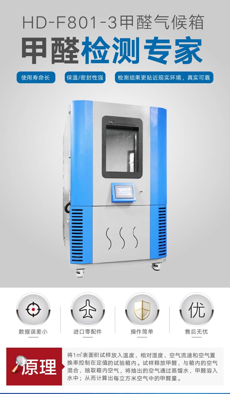 本产品适用于各种人造板、复合木质地板以及地毯、地毯衬垫及地毯胶粘剂等室内装修材料甲醛释放量的测定、木材或人造板的恒温、恒湿平衡处理,也可用于其它建材中挥发性有害气体的检测。该产品zui大特点在于可zui大限度的模拟室内气候环境,检测结果更贴近现实环境,因而真实、可靠。