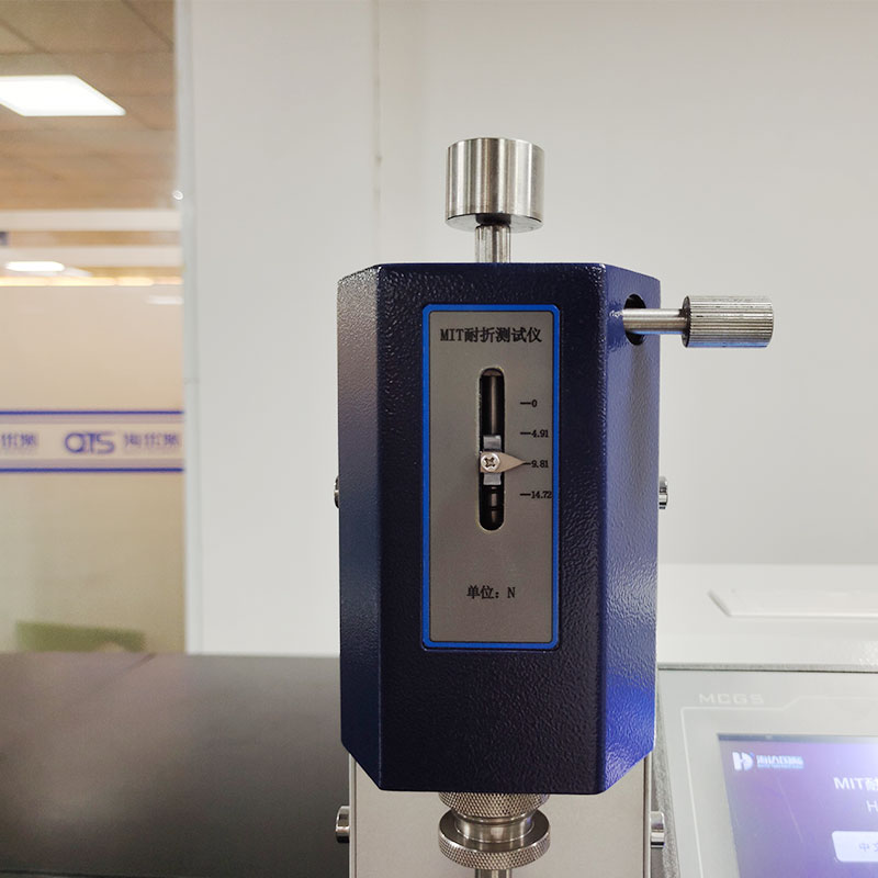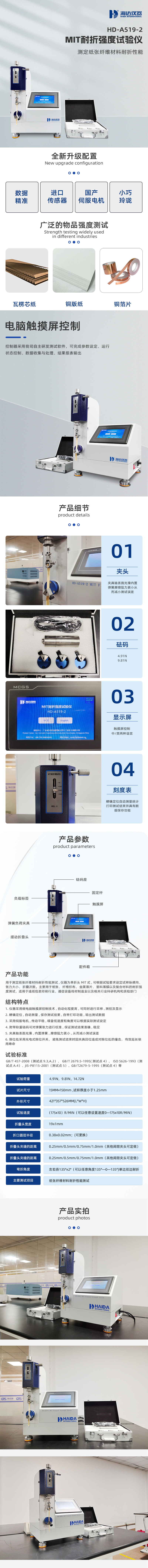 本机专门检测纸及纸板之耐折强度,试法是将试片两端固定于机上,下夹具施与所须之荷重,使试片承受一定之张力,下夹具在试片垂直状态下向左右两边往复弯折试样,弯折角度为135度,直到折断试片,并自动计数。