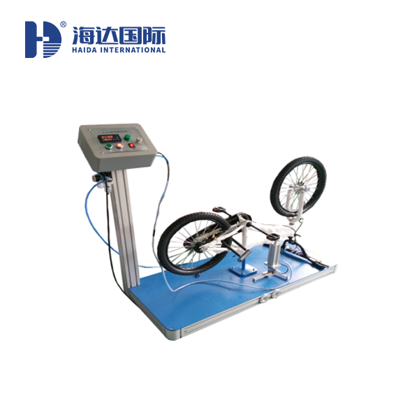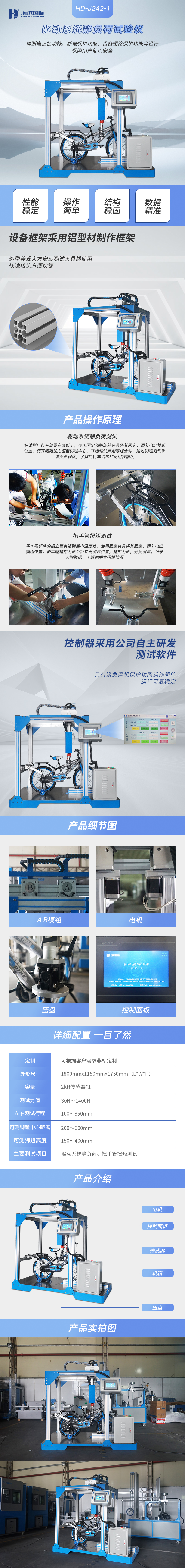 产品简介 本设备主要测试自行车驱动系统的静态强度,取左曲柄处于向前、水平位置,在左脚蹬的中心垂直向下施加一力F,逐渐达到1500N,保持1min(GB为15S)。 万一在负荷的作用下,由于系统屈服或驱动链轮张紧而使曲柄转过水平面以下30°位置时,将曲柄重新回到水平位置,或者考虑到系统的屈服,而将曲柄置于水平面以上某个位置,再重复试验;在完成左曲柄的试验之后,应将右曲柄取向前水平位置,并将力施加在右脚蹬上,重复该试验。